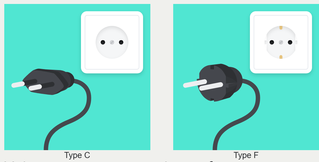 The power supply in Germany operates at 230V and 50Hz. The common electrical sockets are types C and F (see below). Plug type C has two round pins, while plug type F also has two round pins along with two grounding clips on the sides. You may need a power plug travel adapter to use your devices.